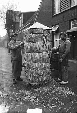Village pump in Diepenheim, Netherlands, being packed in straw to prevent freezing (1950) [add]